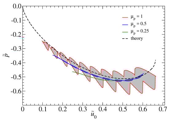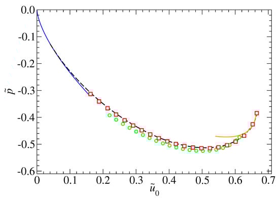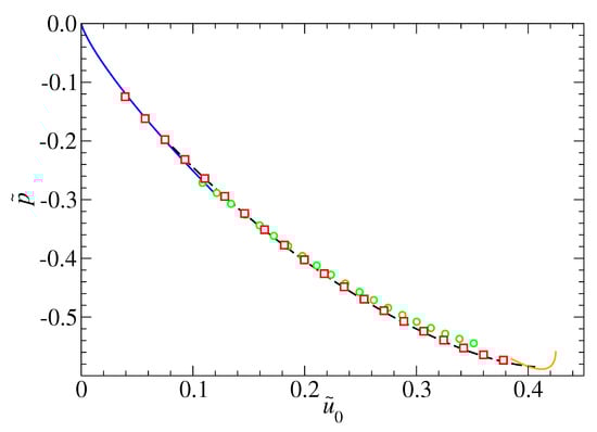 Reduced pressure as a function of reduced displacement for different values of , i.e., for (green, small circles) and (red, large squares). For these calculations, dimples were suppressed by making the cell in the y direction infinitesimally thin. The full blue and the full orange line represent the thick-line and critical-point asymptotics, respectively, while the dashed black line shows a direct numerical analysis of the GFMD data from Figure 5.