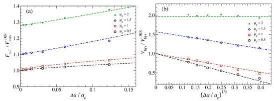 It is easily found, as in this contribution, that a Tabor parameter of is sufficiently large to produce a load-displacement curve in contact similar to that obtained in the limit of infinitesimally short-range adhesion, which was solved by Johnson, Kendall, and Robertson (JKR) []. However, the approach is scarcely ever explored, although it is decisive for the unavoidable hysteresis that ensues as a consequence of the difference between the approach and the retraction curve. In a study addressing a full approach and retraction cycle of an adhesive Hertzian indenter, Ciavarella et al. [] found that the energy loss is substantially reduced by finite Tabor parameters compared to the idealized case of zero-range adhesion, e.g., for by almost a factor of two and by still for a Tabor parameter as large as . This latter value would be characteristic of a soft-matter interface with the following order-of-magnitude specifications: local radius of curvature of 100 nm, surface energy of 100 mJ/m2, interaction range 4 Å, and a contact modulus of 10 MPa. Based on this ballpark estimate, it appears as if most soft-matter systems are locally sticky, even if typical surface roughness at large wavelength destroys that stickiness at macroscopic scales [,,]. Rather than simulating such interfaces with , it might be desirable to run simulations with much smaller and to extrapolate to the desired , which may often be approximated as infinity. While Ref. [] certainly contains implicitly a recipe for this interpolation, it is neither explicitly stated nor is it clear if it extends to geometries beyond parabolic tips. Thus, one purpose of this work is to explore how to extrapolate numerical results for adhesive losses to short ranges.