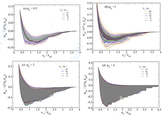 Since both considered potentials have the property that repulsion decreases more quickly with distance than attraction, they should lead to qualitatively similar behavior, just like other potentials with that property. However, moderate changes in the adhesion law can still affect some computed properties quite substantially. This is why some thought should be spent on the choice of the potential. If the goal is to construct a CZM starting from the atomic scale, a properly constructed Mie potential would be a good candidate, in particular if the adhesion arises mainly from dispersive or van-der-Waals forces. If, however, the mesh-elements are more than a few microns in size, the CZM should reflect the proper contact mechanics of the underlying microscopic (random) roughness and the functional form be chosen accordingly. As we find in preliminary simulations of adhesive, randomly rough surfaces, these CZMs can be similar to the Morse potential, as they can be well described by a difference between two exponentially decaying functions. In fact, a purely repulsive, non-overlap constraint between an elastomer and a randomly rough surface effectively leads to an exponential between the two surfaces [,]. If, however, the goal is to reach the continuum limit as quickly as possible, yet different choices are possible, e.g., the one introduced later in Equation (31).