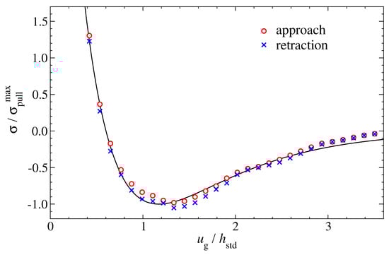 For the simulations on ideally flat surfaces in this study, we decided to use the Morse potential. In hindsight, we could argue that this was done to represent the formation and the detachment of a randomly rough surfaces at a coarse scale. Two properties of the Morse surface-energy density are needed in the remainder of this article. First, the maximum tensile traction, i.e., the maximum of the first derivative of the r.h.s. of Equation (3). It is given by and located at an interfacial separation of . Second, the negative minimum curvature, which can be deduced to be . It occurs at an interfacial separation of . Moreover, note that the radius of curvature of a flat contact is formally infinite (at least in the limit ) so that the (usual) Tabor parameter can be said to diverge automatically and thus the interaction to be short-ranged irrespective of the numerical value of .