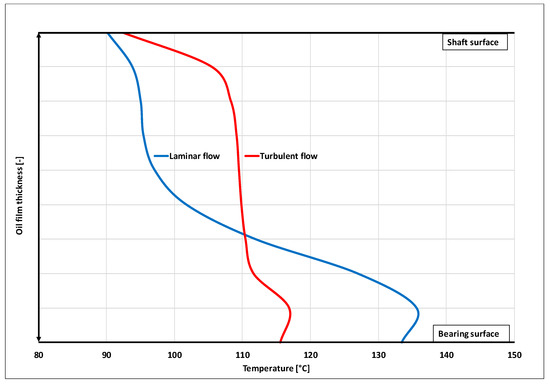 Exemplarily predicted laminar and turbulent flow profiles across the oil film at the position of the highest bearing temperature.