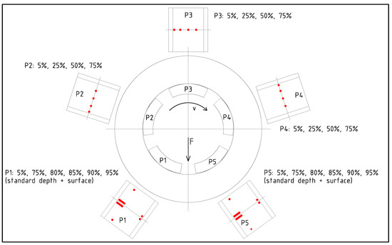 At each defined circumferential position, two thermocouples were placed, one soldered into the bearing metal, with approximately 0.3 mm radial distance to the sliding surface and a second 1 mm below the white metal, corresponding to approximately 4 mm below the sliding surface for this bearing size, the same distance as the typical 75% sensor position of customer bearings. Thus, one temperature sensor in each pad of the test bearing is placed very similar to the standard sensor of customer bearings.