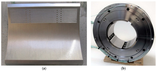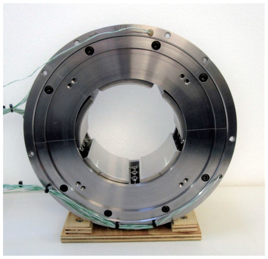 After the completion of the test program with plain pads, the loaded pads were re-machined and equipped with eddy grooves. According to the details described in [10], eddy grooves are physical grooves in a specific area of a pad with a particular shape, arranged in a particular pattern, as shown in Figure 6a for the test bearing. The bearing assembly with eddy grooves is shown in Figure 6b.