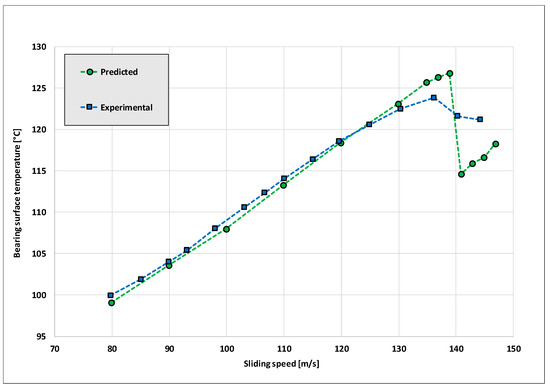 To verify the prediction of the natural flow transition speed, an initial test was carried out in which the shaft speed was incrementally increased, with otherwise constant parameters. The result of the temperature measurements is shown in Figure 7. The predicted and measured transition speeds are in good agreement, while the predicted temperature drop is significantly higher than the experimentally observed value. Despite this difference, the test confirms that the flow transition occurs, even at this moderate load of 1.5 MPa, at speeds considerably above normal operating conditions.