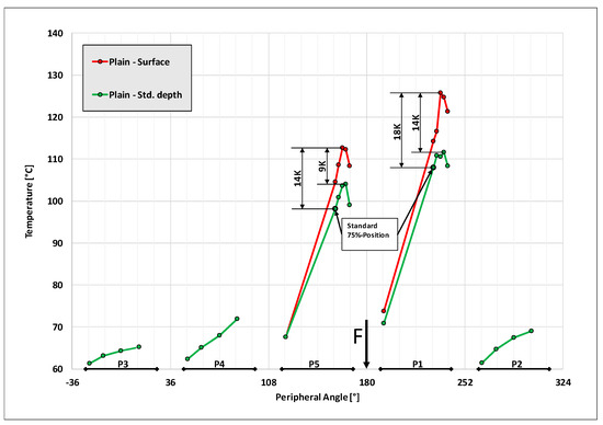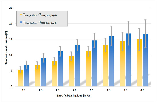 Figure 9 summarizes the differences between surface and standard depth temperatures, individually for both the max temperature and the 75%-position temperature as a function of the specific bearing load by averaging all measurements taken at the same bearing load at rotor speeds between 50 m/s–110 m/s.