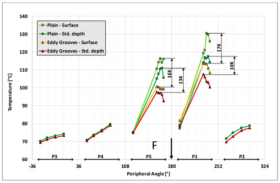 The effect was clearly visible at all tested speeds and increased with the bearing load and sliding speed. Figure 10 shows a measured temperature comparison over all five pads for a high speed, high load case: the eddy groove bearing develops 16 K/17 K lower maximum surface temperatures than the plain bearing. The temperature reduction at the standard depth is 13 K/10 K, which is lower than at the surface, but still significant.