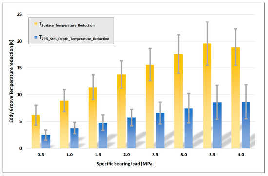 By averaging all measurements taken at the same load at rotor speeds between 50 m/s–110 m/s, Figure 11 summarizes the reduction of maximum surface temperatures and the standard 75%-position temperatures due to eddy grooves compared to the plain bearing: the eddy groove cooling effect at the bearing surface is strong, especially at high bearing loads, while the temperature reduction at the 75%-position is only moderate. The reduced impact on the 75%-position standard thermocouple measurement result was expected because the eddy groove effect takes place in the oil film near the bearing surface and naturally becomes smaller with increasing distance. However, the surface temperature reduction has the clear potential to be used to increase the safety margin or power density of a bearing.