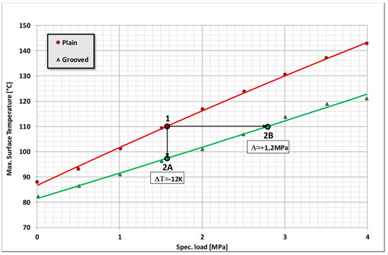With the eddy groove modification of this bearing, opportunities arise to either use the benefit solely for a temperature reduction by 12 K and thereby increase the operational safety of the bearing, indicated by point 2A, or to use the full benefit to increase the bearing load at a constant maximum temperature, shown as point 2B. A new point of operation between 2A and 2B would result, compared to point 1, in a reduced bearing temperature in combination with an increased bearing load.