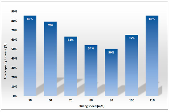 Summarized temperature-related relative increase of load capacity by eddy grooves, compared to the plain surface. The figures represent the mean increase of bearing load capacity at the given sliding speeds for identical maximum surface temperatures.
