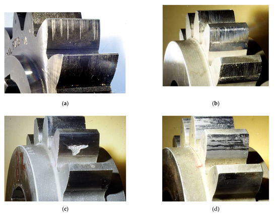 Occurring sliding wear, which will also be referred to wear in the following, leads to mass loss and a wearing off of the hardened case layer, which limits the gear load carrying capacity. A typical wear damage on a gear wheel can be seen in Figure 1b. The characteristic parameter for the risk of wear is the minimum lubricant film thickness. As a result, the viscosity and the additives of the gear lubricant are important for the wear load carrying capacity. The gear geometry regarding the sliding speed, the gear module and adequate profile modifications also have an impact on the wear behavior. Additionally, the wear load carrying capacity is influenced by the heat treatment, the surface hardness, the surface roughness and the accuracy grade of the gears [4,28].