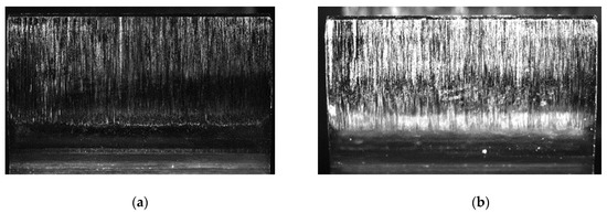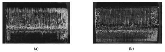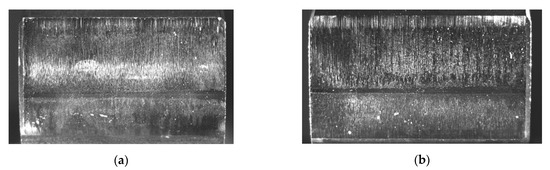 Scuffing on gears leads to a limited gear load carrying capacity, because of the changed properties on and below the flank surface of the gears. A typical scuffing damage on a gear wheel can be seen in Figure 1a. The main influence parameters on scuffing, beside the lubricant properties itself, are the oil temperature, the load, the coefficient of friction and the sliding speed. In order to avoid scuffing, a maximum allowable temperature in the contact area, which depends on the combination of gear material and gear lubricant as well as the kind of heat dissipation and lubrication system, may not be exceeded. Therefore, the microstructure in the case-hardened layer regarding the retained austenite and the geometrical accuracy as well as the profile modifications are important for the scuffing load carrying capacity. Especially the type of additives as well as the additive concentration, the oil viscosity and the chemistry of the base oil, which influences the coefficient of friction, have a high impact on the scuffing load carrying capacity [2,28].