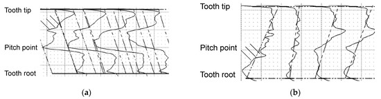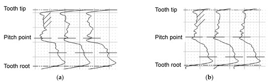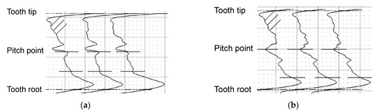 Figure 12 shows the profile measurement of three teeth evenly distributed over the circumference for pinion and wheel. The profile measurement agrees with the optically detected characteristics of the wear damage. A higher material loss can be seen below the pitch point than above the pitch point. Additionally, a scrape mark due to mesh interference can be detected in the dedendum of the pinion and wheel.