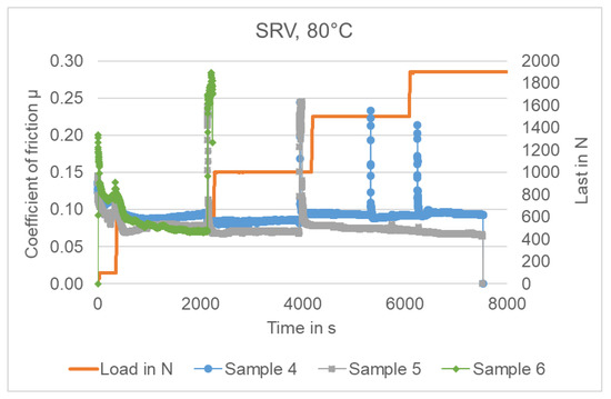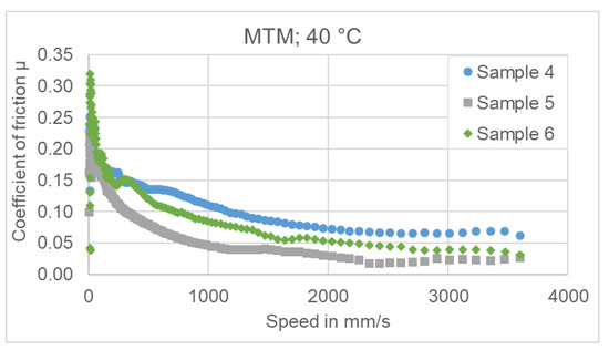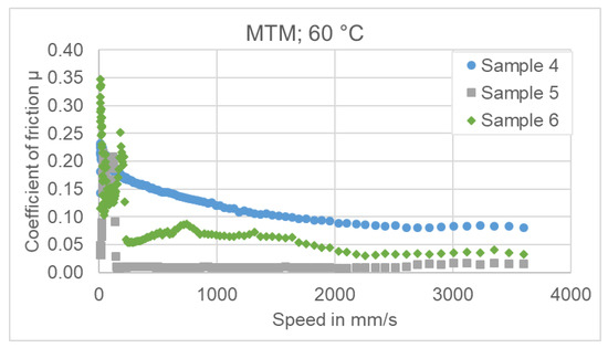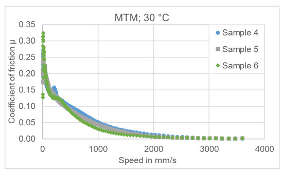 The measurements with the MTM at 30 °C show very similar good behavior in the high velocity range (slide friction area). Sample 4 and 6 show some unsteady events with high friction coefficient in the low and very low speed range (mixed friction) which can be interpreted as insufficient lubrication events. This can be seen in Figure 16.