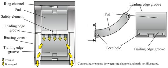 - Kukla, S.; Buchhorn, N.; Bender, B. Increase of Operational Safety of Tilting-Pad Journal Bearings by Extraction of Hot Oil at the Trailing Edge. In Proceedings of the ASME 2015 Power Conference Collocated with the ASME 2015 9th International Conference on Energy Sustainability, the ASME 2015 13th International Conference on Fuel Cell Science, Engineering and Technology, and the ASME 2015 Nuclear Forum, San Diego, CA, USA, 28 June–2 July 2015; p. V001T13A007. [Google Scholar] [CrossRef]