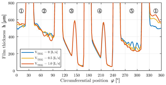 Experimentally determined oil film thickness (µm) over the circumference in the bearing center (pads 1–5) with and without feeding of the TEG. Operating point: n = 3000 rpm and = 3.00 MPa.