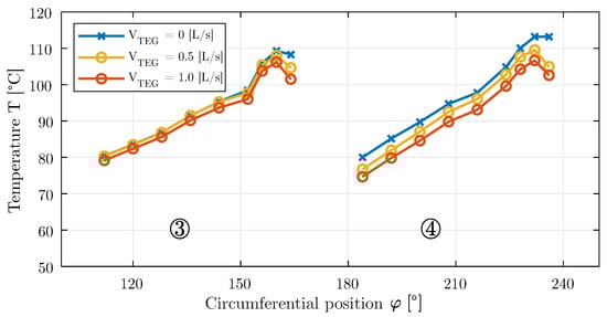 Measuring point temperatures (°C) of pads 3 and 4 in the axial center of the bearing (z = 0 mm) with and without feeding of the TEG. Operating point: n = 3000 rpm and = 3.00 MPa.