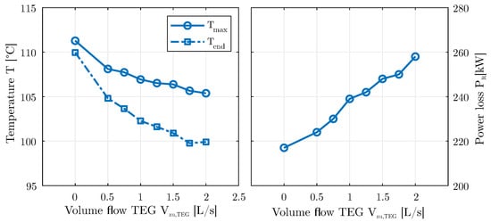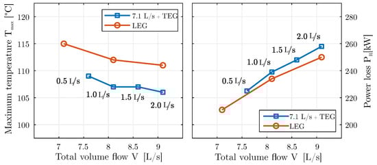 Experimentally determined maximum and final temperatures (°C) of pad 3 as well as the power loss depending on the supplied volume flow of the two cooling grooves. Operating point: n = 3000 rpm and = 3.00 MPa.