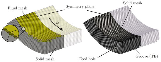 Illustration of the CFD model with reduced number of nodes. Left: Tilting-pad (grey) and fluid mesh (yellow) without additional supply groove. Right: Tilting-pad (grey) with TEG (fluid mesh not shown).