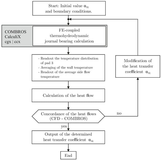 According to the current state of the art, the oil flow in the bearing is not modeled except for the lubrication gap. Thus, in TPJB oil flow in oil supply grooves and the intermediate space between the pads is not taken into account. A consideration of coupled heat flows at the interfaces of the individual regions (bearing ring-lubricating film-shaft) is therefore not possible. To describe the heat dissipation at the interfaces of the bearing, heat transfer coefficients (HTC) are required at the free pad surfaces (leading edge, trailing edge, axial edges, pads back) or the outer system boundaries.