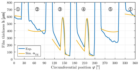 Measured and calculated film thickness (µm) over the circumference in the center of the bearing (pads 1–5) with an additional cooling oil volume flow of L/s. Operating point: n = 3000 rpm and = MPa.