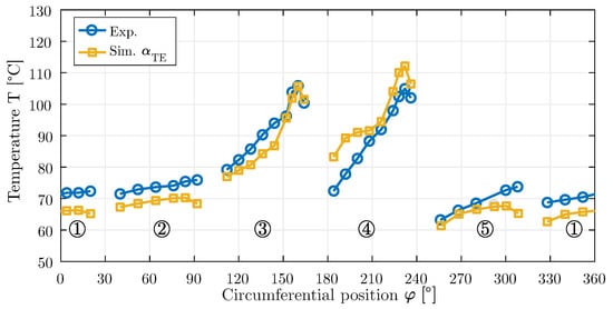 Measured and calculated measuring point temperatures (°C) over the circumference in the center of the bearing (pads 1–5) with an additional cooling oil volume flow of L/s. Operating point: n = 3000 rpm and = MPa.