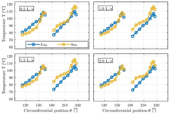 Measured and calculated measuring point temperatures (°C) of pad 3 and 4 over the circumference in the center of the bearing for the different cooling oil volume flow rates. Operating point: n = 3000 rpm and = MPa.