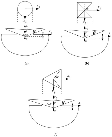 - Atkins, A.G.; Tabor, D. Plastic indentation in metals with cones. J. Mech. Phys. Solids 1965, 13, 149–164. [Google Scholar] [CrossRef]