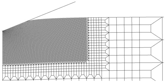 The finite element analysis was performed using the commercial finite element package ABAQUS [26]. The finite element mesh is depicted in Figure 3. Here, only details close to the region of contact is shown but it should be emphasized that it was properly ensured that the entire meshed region was sufficiently large to avoid interference from the outer boundaries. The finite element mesh consisted of four-noded, axisymmetric elements being of hybrid type, i.e., the displacements were approximated with bilinear shape functions while the hydrostatic pressure attained a constant value in each element, in order to improve the convergence at close to incompressible deformation. The simulations were performed by controlling the displacement of the rigid conical indenter while keeping the outer boundary of the meshed area in a fixed position. Large deformation theory was used throughout the simulations with a single exception discussed below.