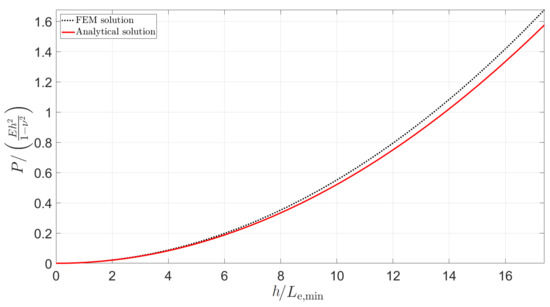 Analysis of conical indentation of a linearly elastic half-space. Comparison between present finite element results (accounting for large deformations) and the analytical solution by Sneddon [1] as detailed in Equation (16). In the figure, Le,min is the minimum element side length in the region of contact.