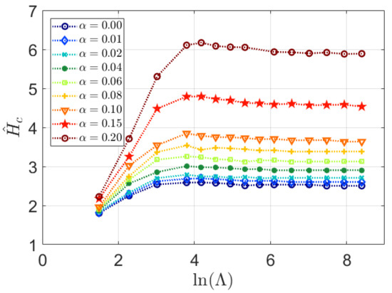 In Figure 10, the predictions from Equations (22) and (23) are compared and clearly, the agreement is very satisfactory giving substantial confidence in both the present correlation approaches. It should be noted that according to Figure 10 the results based on Equation (22) yields Ĥc slightly less than the established value of 2.55 at von Mises plasticity (α = 0). Most likely this is due the fact that truly rigid plastic values on py (at high values on Λ) does not exactly agree with the value of py at the transition between level II and level III contact, where Equation (11) is evaluated for the present purpose, due to an overshoot of the explicit values of py at the transition. This has been shown earlier in [28] (Figure 5 in [28]) and also for hardness values as shown in Figure 5. It should then be emphasized that the mechanical behavior is similar for py and the material hardness. Accordingly, if this feature is accounted for even better agreement would be found between Equation (22) and the rigid plastic von Mises solution. This is not elaborated further though remembering that pressure-sensitivity is an issue here.