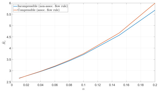 It seems appropriate to first investigate the influence from the plastic flow direction on the present results. In doing so, as already mentioned above, the two extremes, incompressible and associate plastic flow, are considered and compared using the finite element method. The outcome of this comparison is shown in Figure 6 for the normalized cone indentation hardness Ĥc for a particular value on the power law exponent n (n = 0.1) at rigid plastic conditions. Clearly the difference between the two sets of results is small; not only at small values on the pressure-sensitivity parameter α (which could be expected) but also at α = 0.2. Accordingly, this matter will not be dwelt upon further and associative plasticity is adhered to in all the calculations discussed below.