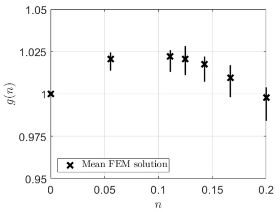 According to the results shown in Figure 7 this is accurately fulfilled at values of n up to 0.2. With the present choice of material parameters, strain-hardening becomes very high at increasing values of n but if the material parameters were adjusted in order to achieve more practically reasonable strain-hardening g(n) would be much closer to 1 also at n > 0.2 or 0.25, cf. [23,27] (in particular Figure 9 in [27]), and this matter will not be investigated further.
