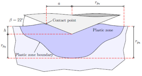 However, in order to explicitly evaluate Equation (20) the size of the plastic zone at rigid plastic conditions, py(α), has to be determined. This is as already mentioned done by finite element calculations but also requires some further considerations to ensure an appropriate evaluation. As schematically shown in Figure 9 it is not immediately obvious how to represent the size of the plastic zone in a correct manner. Decisive results in this context have, however, been presented by Larsson and Olsson [28]. In this investigation it is shown that a constant value on the normalized plastic zone size parameter ph is reached immediately when entering level III contact conditions but not so for pa where elastic effects are noticeable also at ln Λ = 8. Accordingly, there is an agreement in mechanical (contact) behavior between the hardness H and ph and the relative contact area and pa. For this reason, ph is used to determine the plastic zone radius py in Equation (20), and consequently in Equations (13) and (15). Indeed, regarding details, remembering the fact that large deformation theory is relied upon presently, py = ph − h, h being the indentation depth, is adhered to as shown in Figure 9. Second-order polynomial curve-fitting based on (rigid) ideally plastic finite element simulations then yields