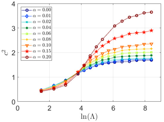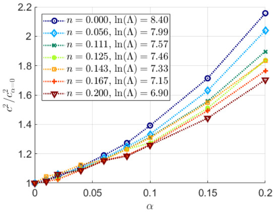 Concerning the parameter c2 defined in Equation (5), it is stated in the previous discussion that also this parameter can in particular situations be determined in closed form as a function of material parameters. Accordingly, in such situations it would be suitable for material characterization. However, as also mentioned above, elastic effects will severely influence this parameter and this feature makes c2 much less useful when it comes to the determination of material properties. For completeness and as a basis for possible future analyses, explicit FEM results, pertinent to c2, will also be presented below.