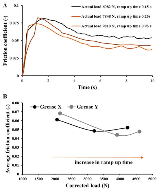 Figure 4A, the friction coefficient increased and then decreased before reaching a stable plateau. The average friction coefficient for grease X and Y decreased as there was an increase in corrected load, that was driven by an increase in speed ramp up time (see