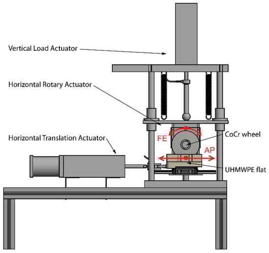 Figure 2) For testing, the UHMWPE specimen was mounted on a sled that translated freely on a linear ball bearing along the horizontal axis, driven by a servo-hydraulic actuator, which was closed-loop controlled. The anteroposterior (AP) movement of the tibial plateau was simulated by a flat sample with movements ranging from 1 mm to 6 mm. The wheel represented a femoral condyle and simulated the flexion—extension (FE) movement of the knee during a gait cycle. The movements ranged from 0 deg to 60 deg and consisted of FE and AP motions as defined by the international standard for knee wear testing ISO 14243-3 (displacement control) [