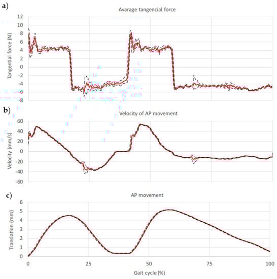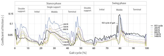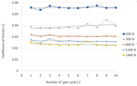 Figure 7 displays the CoF values (the average value from 10 cycles) within the range of loads of the gait cycle. The load of 200 N had an average CoF of 0.056 (SD 0.001) for 10 gait cycles. As the load level increased, the CoF decreased. The lowest CoF value of 0.023 (SD 0.001) was measured for the constant load of 1400 N.