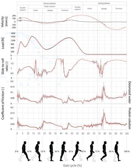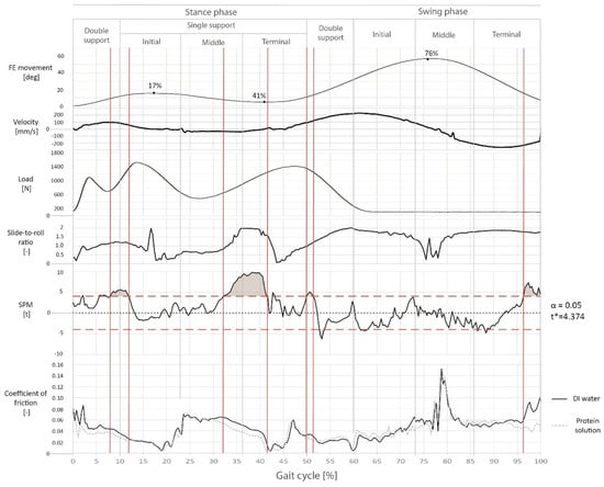 Figure 5). For DI water, the mean value of the CoF was 0.038 (SD 0.019) in the stance phase and 0.055 (SD 0.024) in the swing phase. The mean friction coefficient for the protein serum was 0.034 (SD 0.017) in the stance phase and 0.052 (SD 0.022) in the swing phase. Differences between the mean values are not substantial, but a more detailed analysis using SPM revealed sections that were statistically significantly different from each other. A combination of factors may have caused this; SRR being one of them, dynamically forming the film of lubricant and thus influencing the CoF.