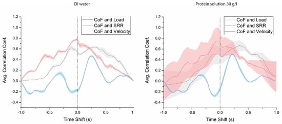 Using the cross-correlation to investigate the similarity between the CoF and load, velocity, and SRR, the highest correlation coefficient was found between CoF and SRR, reaching a peak of 0.75. The correlation between CoF and load reached the next highest correlation coefficient, while velocity had no influence (