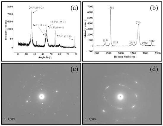 Characterization of turbostratic graphite powder: (a) X-ray diffraction—indexed as graphite by standard charts ICSD 52230; (b) Raman spectrum; (c) the SAED pattern showing the basal plane (002); and (d) the SAED pattern showing elliptical rings typical of disordered structures.