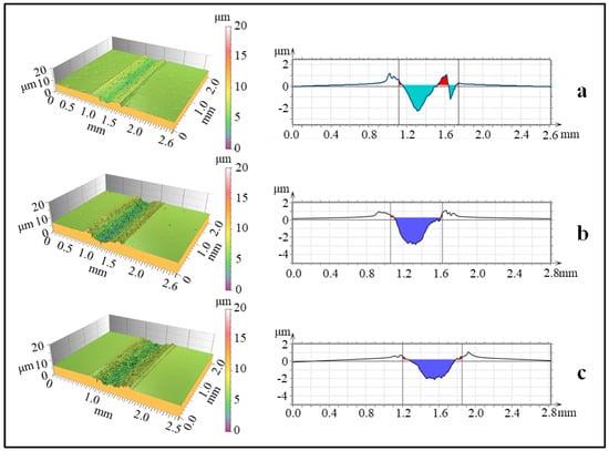 Typical aspects and average profile of the wear scars obtained by white light interferometry. (a) DTG. (b) Pure oil. (c) DCG.