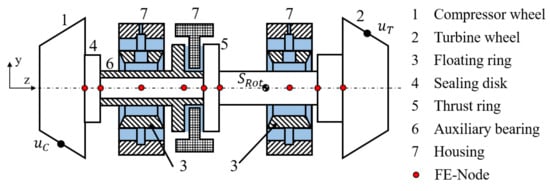 The examined rotor consists of an elastic shaft, the compressor and turbine wheel, as well as the sealing disk, auxiliary bearing and thrust ring (cf. Figure 1). To model the elastic deformations of the shaft, the Finite-Element-Method (FEM) according to the Timoshenko beam theory [] is applied. The FE-nodes are positioned at relevant shaft shoulders as well as at the bearings in order to determine the lubrication gap. Furthermore, the components assembled on the shaft can be defined as rigid bodies and their inertia properties are assigned to the corresponding FE-nodes. The total mass of the rotor is = 20 kg and its centre of gravity is located close to the turbine bearing. To take the unbalance condition of the rotor into account, the compressor and turbine wheel have an unbalance distribution with an angular offset. In addition to the rotor, the compressor and turbine side floating rings exist as separate rigid bodies within a multi-body environment. The interaction between the individual components is realised via the resulting forces and torques of the hydrodynamic films. These are marked blue in the figure. As a result, there is an interaction between housing and bushing (outer lubrication gap) and between bushing and shaft (inner lubrication gap) at the journal bearing. The forces and torques occurring at the thrust bearings act between the bearing housing (inertial system) and the thrust ring or auxiliary bearing.