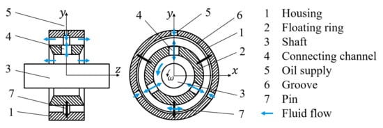 Schematic representation of the floating ring bearing with considered fluid flows.