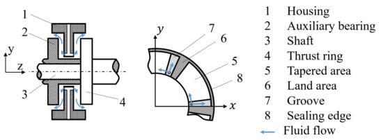 For the axial support of the rotor, thrust bearings are used. With regard to the design, each segment has a wedge, flat and groove area, whereby the oil is supplied through holes in each groove area. To avoid the oil flowing off at the outer edge, the thrust bearings are additionally sealed. A sealing effect is achieved by the fact that the outer bearing edge has no contour. Due to the turbocharger design, the axial lubrication films on the compressor and turbine sides can be considered separately. A schematic design of the thrust bearing can be seen in Figure 3.