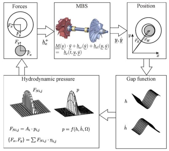 is solved, where is equal to the inertia matrix and represents the state vector of the bushings and the degrees of freedom of the elastic rotor. In addition, the gyroscopic effects, centrifugal and Coriolis forces as well as the stiffness and damping properties of the shaft are taken into account. External forces such as the unbalance or resulting forces of the hydrodynamics are summarised in . The workflow of time integration is shown in Figure 4.