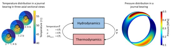 Considering Equations (22), (24) and (29), it becomes clear that a coupled system has to be solved to describe the thermo-hydrodynamic processes in journal bearings. The interaction consists of, on the one hand, the thermodynamics and hydrodynamics within the lubricating film and, on the other hand, of the heat transfer processes between the fluid and the shaft, bushing or housing. The interrelationships and holistic interactions are shown in Figure 6.