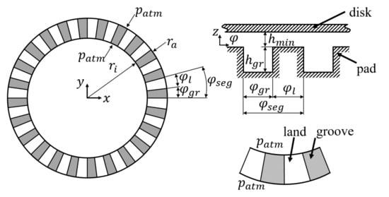 In this section, the results of the validation for hydrodynamics at thrust bearing are shown. For this purpose, a comparison is made with the results of Hao []. The corresponding experimental investigations were carried out by Zhang []. The considered thrust bearing consists of 24 segments, where each of them has a flat and grooved area (cf. Figure 7). Furthermore, ambient pressure is assumed at bearing edges. Under these conditions, the lubricant fraction at inner and outer radius is equal to , which has the consequence that the oil is supplied to the lubrication gap via the bearing edges. The bearing design and the corresponding operating boundary conditions are summarised in Table 1 and Table 2.