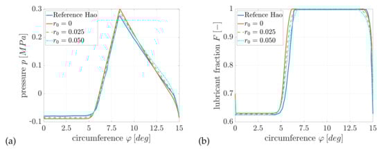 To determine the pressure distribution, the Reynolds equation with consideration of centrifugal inertia, according to Equation (9), is evaluated for stationary operating conditions and iso-viscous temperature distributions. In [], the implementation of mass-conserving cavitation is analogous to the principle of dissolved and undissolved gas masses explained within this contribution. However, a temperature- and pressure-dependent Bunsen coefficient was assumed, which is approximated via an exponential approach. In contrast, within this contribution the Bunsen coefficient is constant. Furthermore, it should be mentioned that a variation of the reference bubble content is carried out in order to illustrate the influence of already existing undissolved gas masses. The results of pressure and lubricant distribution at the bearing centre plane are shown in Figure 8.