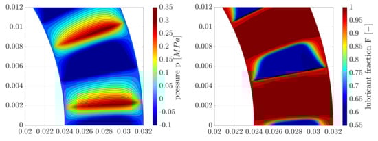 The pressure and lubricant distribution over the entire bearing segment is shown in Figure 9. The cavitation domain occurs mainly at groove area. Since a constant pressure is assumed at bearing edges, a pressure gradient is created at inner and outer radius so that the lubricant can be transported into the gap and thus a pressure is built up at flat area.