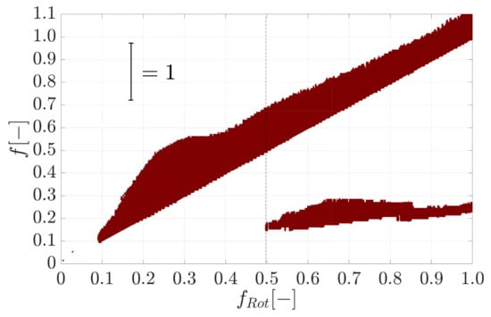 First, the results of the shaft motion measurement are discussed in frequency domain (cf. Figure 10). The figure shows the rotor response frequency as a function of the angular velocity. From of the maximum speed, sub-synchronous oscillation with a rotor response frequency are detected. Besides the oil-whip, the rotor behaviour is also determined by the unbalance-induced vibrations. A synchronous resonance occurs at , whereby the amplitudes decrease after passing the resonance.